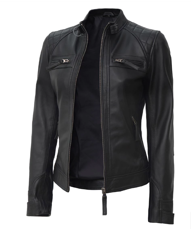 Classic black leather jacket featuring a tailored fit, zip front closure, and multiple pockets. Made from genuine leather with a smooth lining for comfort and durability.